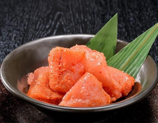 原材料名:助宗鱈卵(北海道産)、食塩、発酵調味料、果糖ブドウ糖液糖、唐辛子、鰹節エキス、魚醬(えびを含む)、たん白加水分解物、酵母エキス/調味料(アミノ酸等)、酒精、ph調整剤、酸化防止剤(V.C)、ナイアシン、着色料(赤102、黄5、赤3)、発色剤(亜硝酸Na)、酵素